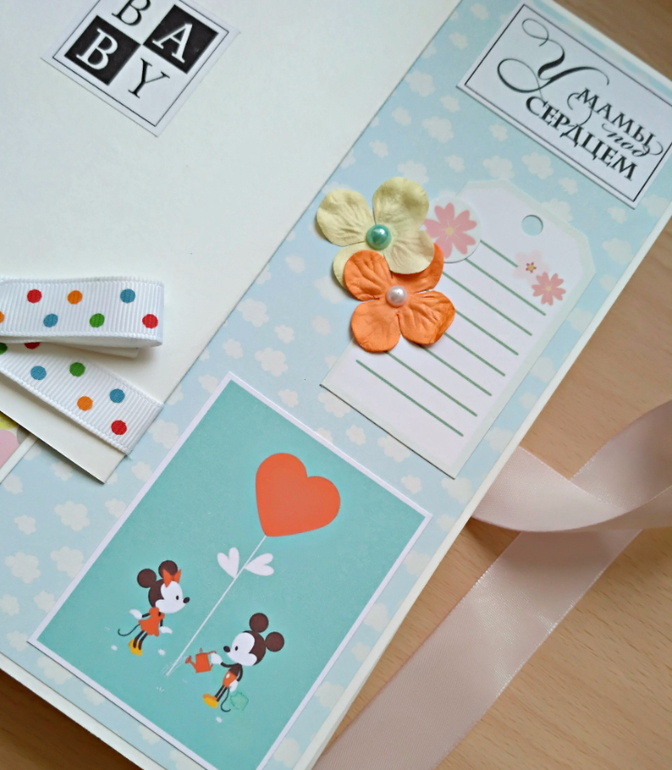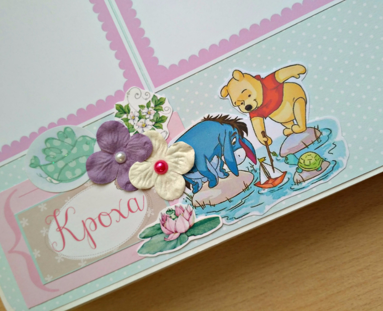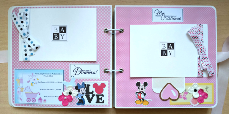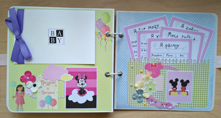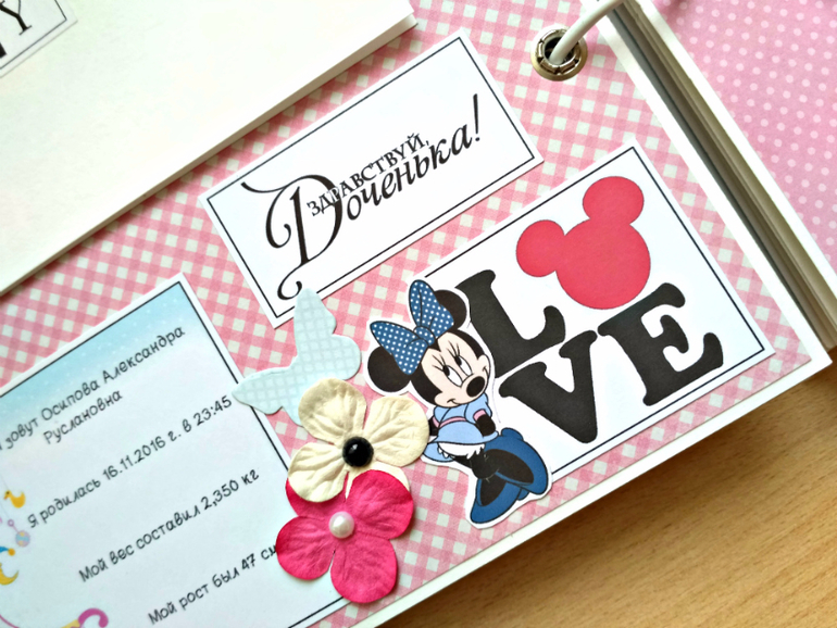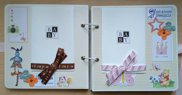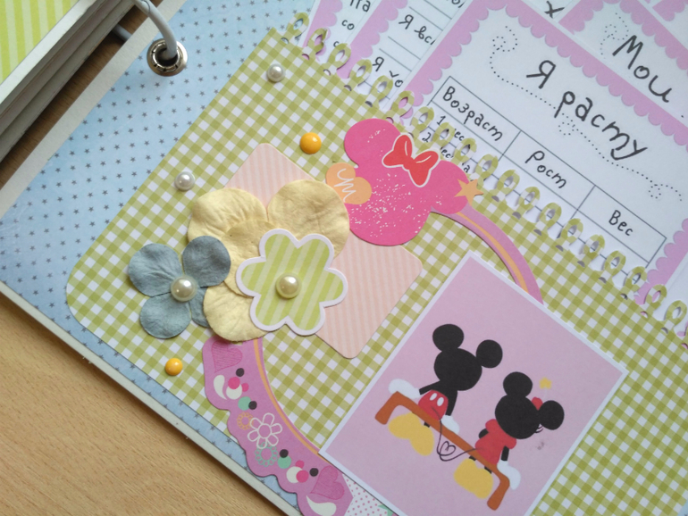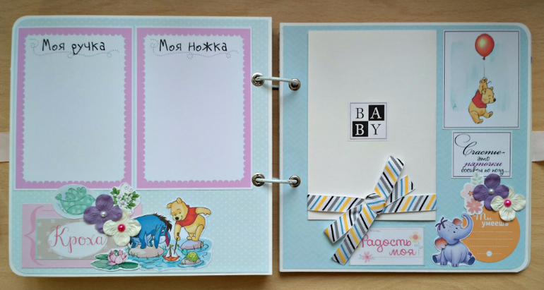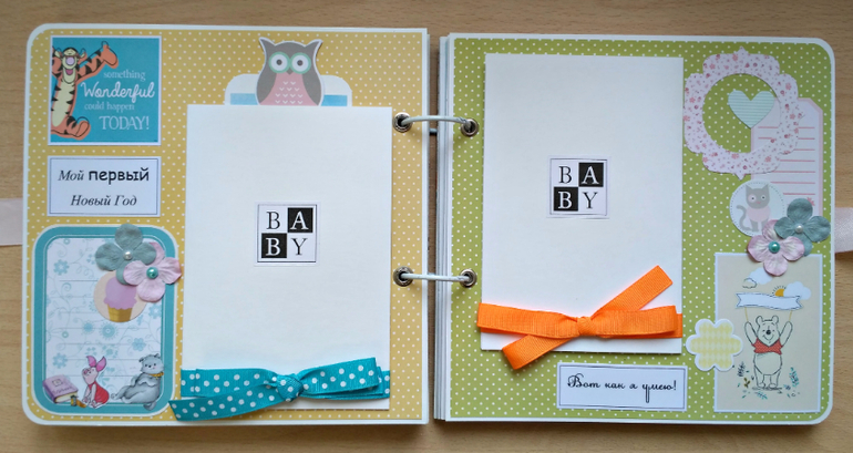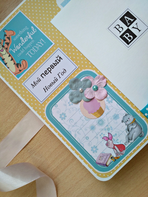 СкрапбукингВсем доброго дня) За окном - зимняя сказка, впереди - Новый Год. А я - с новым альбомом для малышки Александры. Заказчица очень хотела видеть в альбомчике Микки Мауса и Винни Пуха, яркие детальки, но в то же время, чтобы он был милым. Не знаю, но думаю всё получилось (по-крайней мере заказчица осталась оооочень довольна). Итак, альбом 21*23 см, 9 разворотов, вмещает около 50 фото 10*15 см, плюс карточки, места для записей, таблички рост вес, зубки, мои достижения, отпечатки ножки и ручки.
