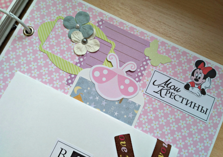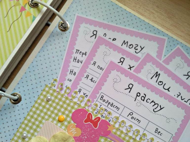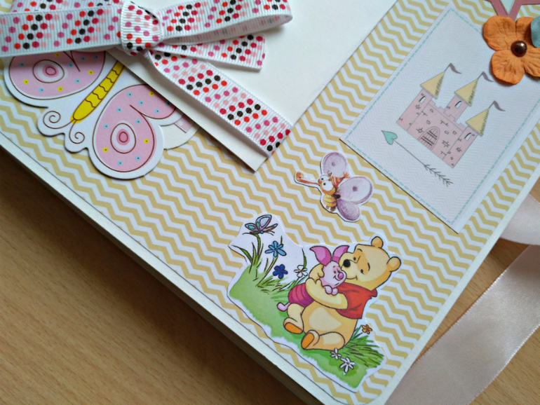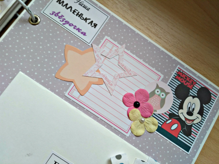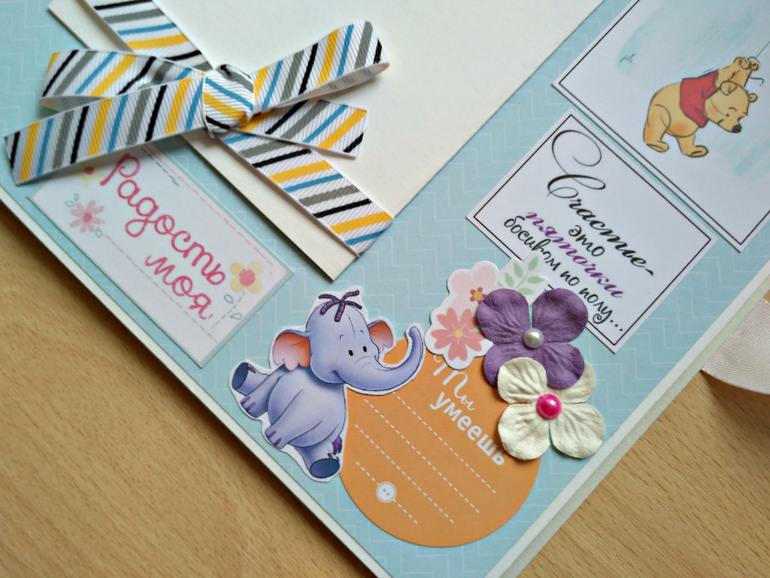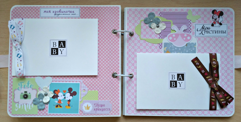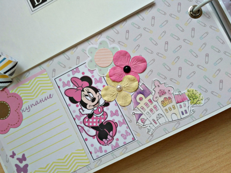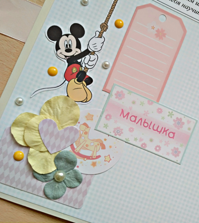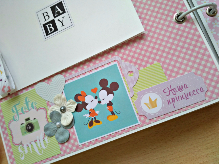 СкрапбукингВсем доброго дня) За окном - зимняя сказка, впереди - Новый Год. А я - с новым альбомом для малышки Александры. Заказчица очень хотела видеть в альбомчике Микки Мауса и Винни Пуха, яркие детальки, но в то же время, чтобы он был милым. Не знаю, но думаю всё получилось (по-крайней мере заказчица осталась оооочень довольна). Итак, альбом 21*23 см, 9 разворотов, вмещает около 50 фото 10*15 см, плюс карточки, места для записей, таблички рост вес, зубки, мои достижения, отпечатки ножки и ручки.