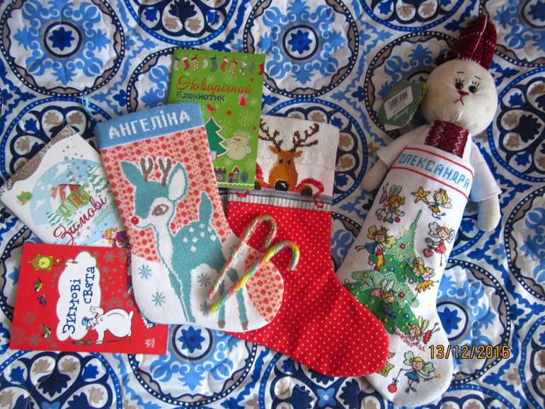 И с подарками, в комплект к блокнотам еще купила ручки с елочками, а также конфеты, но их уже не фотографировала. Сегодня ночью сапожки отправились к своих хозяйкам.
