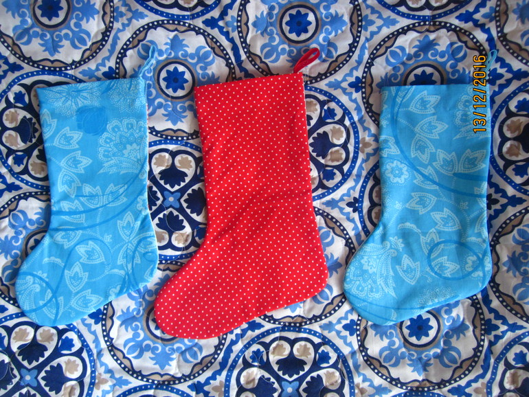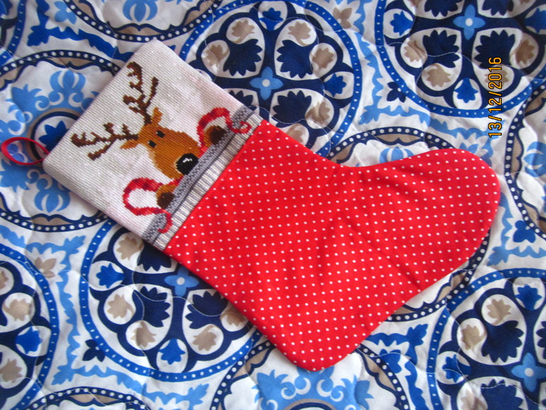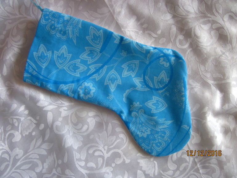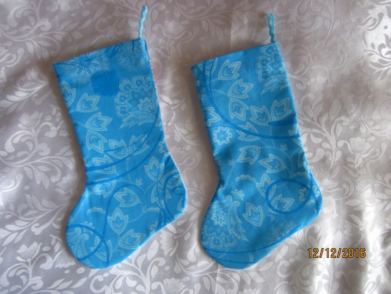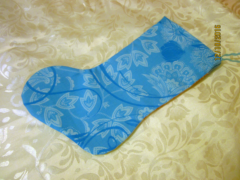 Специально купила два вида ткани - серую с снежинками и красную в горошек, с серой мне показалось что сапожок будет очень бледным, поэтому выбрала красную. С обратной стороны тоже горошки