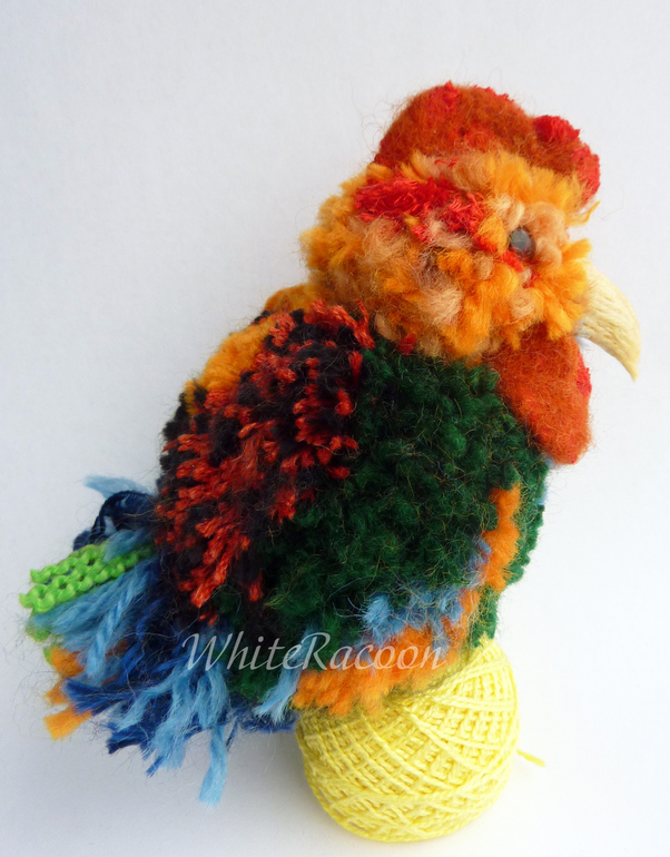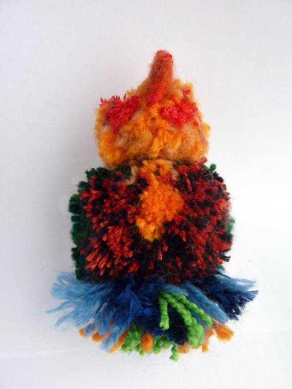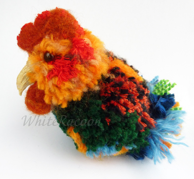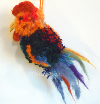 Петух состоит из 2 помпонов в технике цветной намотки, со спинкой и крылышками. А аткже впервые опробовала (можно сказать, изобрела %))) - может и бывает такое, я не встречала) приём валяния в помпоне, т.е. гребешок, бородка и клюв - "цельнокройные", они не вклеены, они вваляны. Держатся крепче некуда (обе дочки им в футбол играют уже 3 недели - он полностью жив и здоров и ЦЕЛ!). И хвост хотела делать "цельнокройным", но он вышел коротковат: