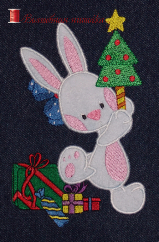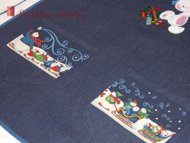 Плотная, но мягкая джинса, на карманах нашиты фрагменты из готовой панели американского хлопка. Основной рисунок машинная вышивка. Зайчик - это аппликация из мягкого велюра.