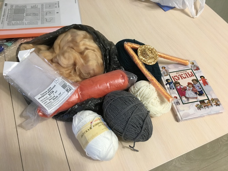 Шерсть для валяния, пряжа, кудри куклам, шляпка, книга.