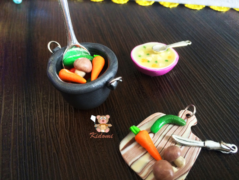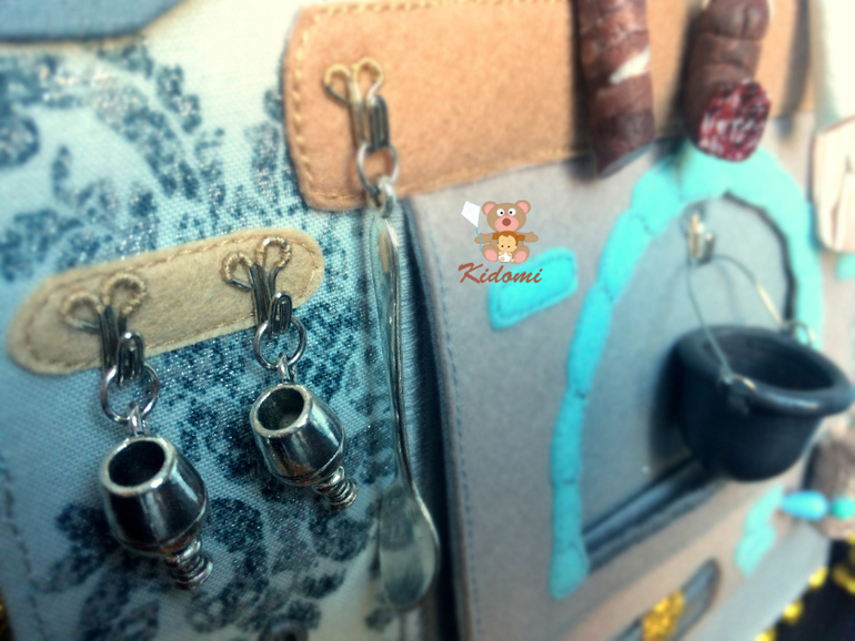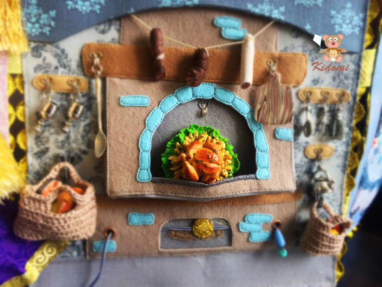 На стенах висит кухонная утварь: замасленный дочерна котел и начищенный до блеска чайник, которые можно повесить в печку, сковорода для приготовления различных блюд, старая, изрезанная ножом доска и острейший нож, а так же недавно наточенный тесак, для нарезки продуктов. Ну и большая ложка для аппетитного супа. Также есть две плетеные корзины с продуктами и связка вкуснейших колбасок под высоким потолком.