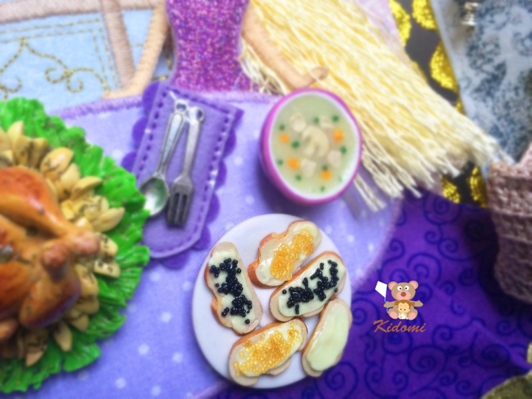 Обед, как и положено, очень сытный. На первое - густейший грибной суп-пюре. На второе - запеченная до золотистой корочки курочка с картошкой. Также можно перекусить бутербродами с икрой, привезенной из дальних стран только сегодня утром, и , как полагается, сыро-колбасная нарезка. Сервировку стола завершает дорогое столовое серебро в специальных салфетках :)