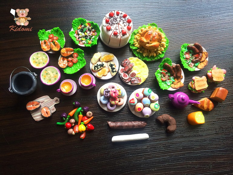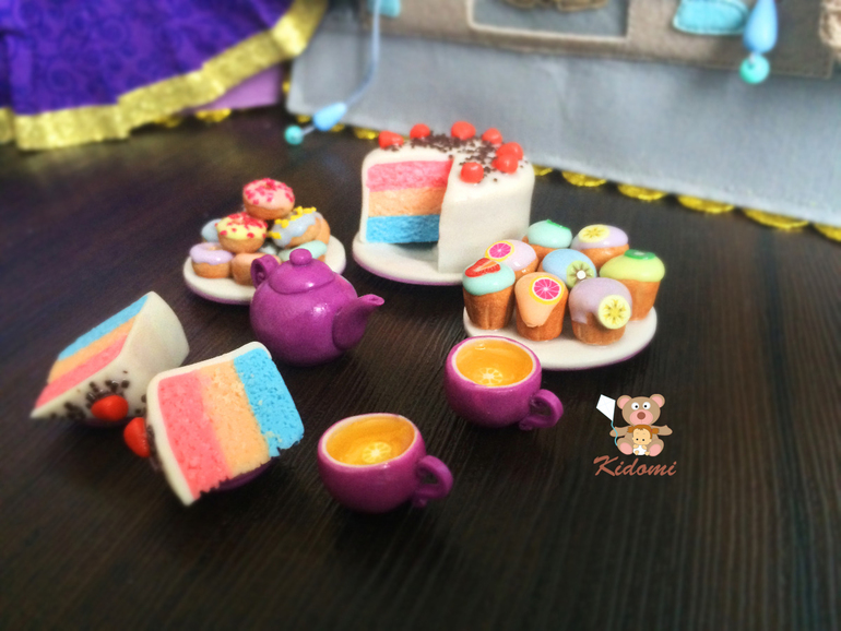 В течении дня можно сделать небольшой перерыв на чай с "вкусняшками". Это и торт, и крошечные кексики, и цветные пончики. А еще, конечно, ароматный янтарный чай с лимоном.