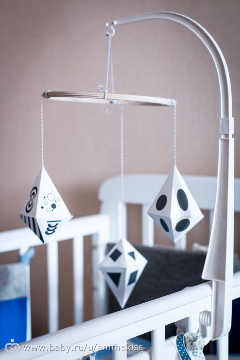 Мобиль штука хорошая. В три месяца мои любили чб рисунки смотреть, но и ярко-разнообразное тоже уже с удовольствием. А можно взять тех что постарше и быстренько наваять каких-нить кубиков из бумаги картона, старшим дать раскрасить - все счастливы. У вас мобиль, дети горды творчеством, мелочь с удовольствием смотрит. Мы вообще из блестящей бумаги кругов нарезали, на нитки их подвесили, и заменили обычные игрушки на fisher price мобиле. Это все блестело, сверкало, колыхалось. А с включенным проектором вообще еще и старшие "залипали" на такое зрелище. Для меня наш мобиль это 30 минут тишины в день