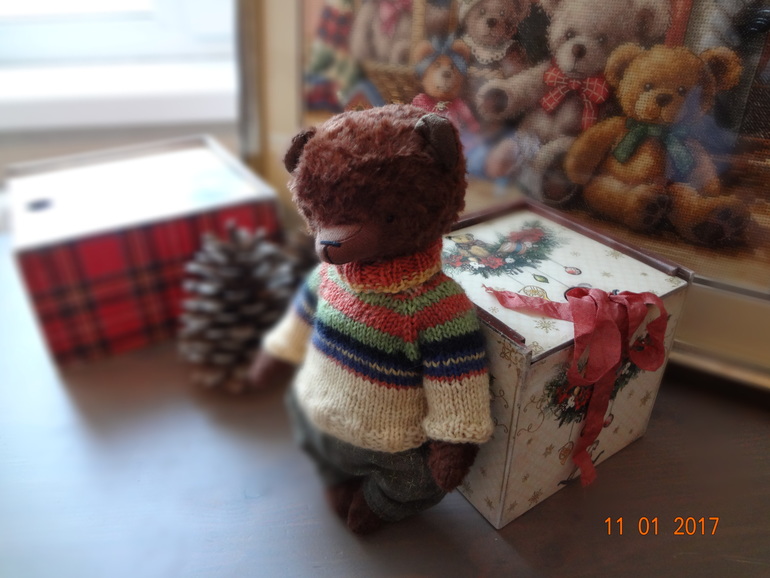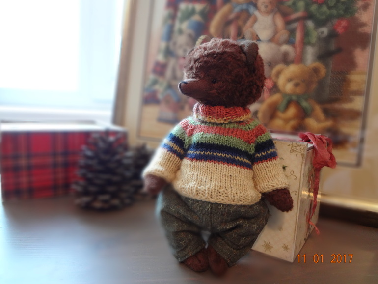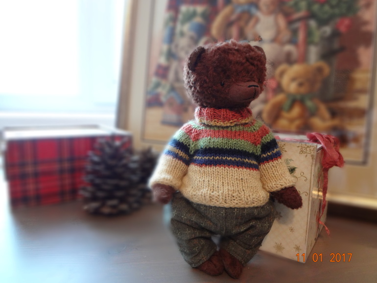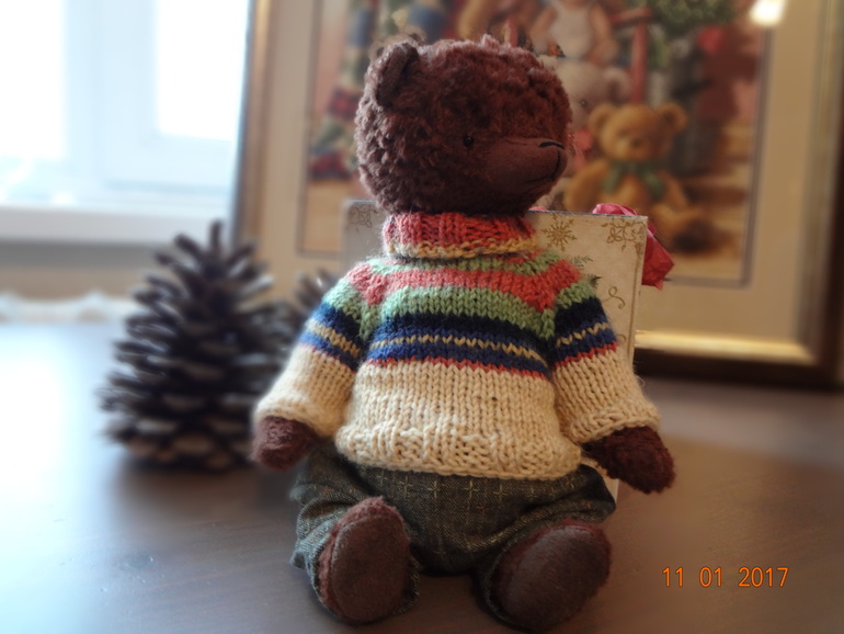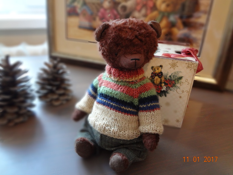 Тедди: мишки и их друзья.Мишка сшит полностью вручную из вискозы ручного крашения шоколадного цвета. Шплинтовое крепление,голова покачивается. Внутри опилки и металлический гранулят. Рост 22см. Мишка стоит с поддержкой,сидит уверенно. Одет в теплый свитер и брюки из японского хлопка. Мишка сшит с большой любовью и теплом.