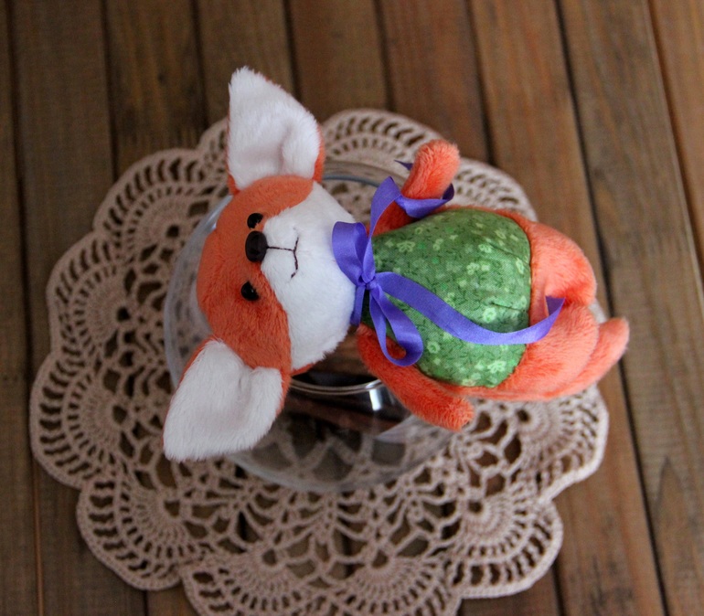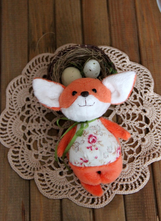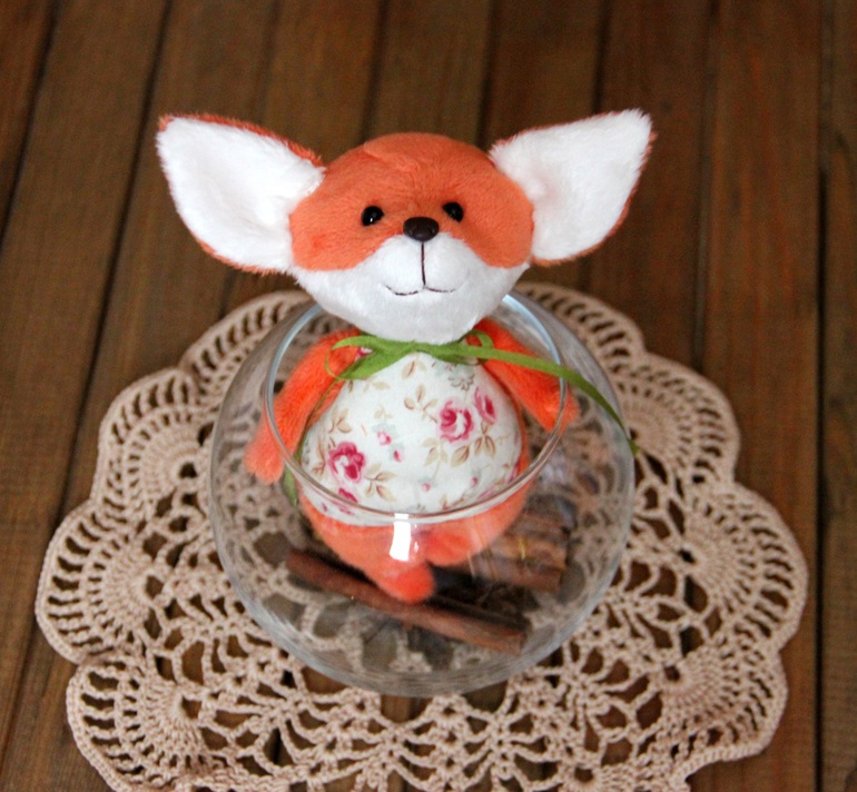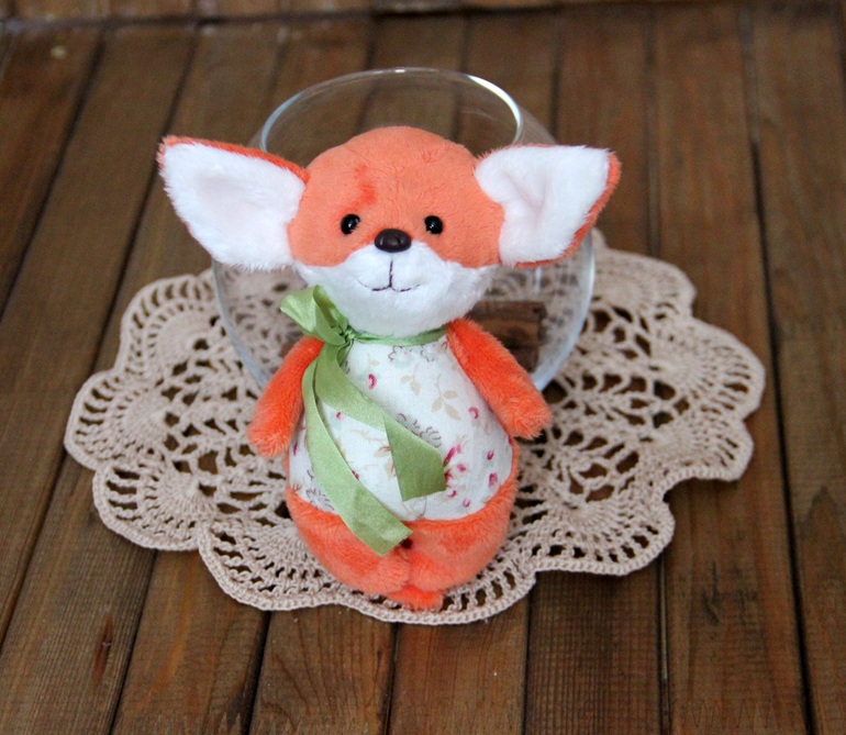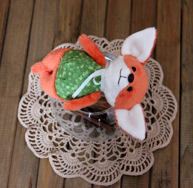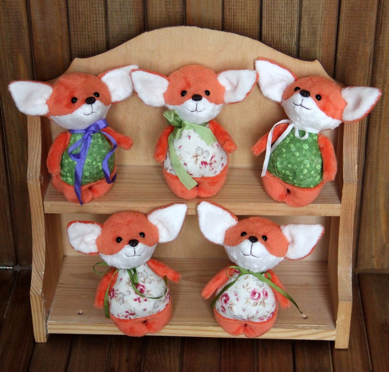Пошиты малыши из плюша - рыжего и бежевого. Пузо из хлопка и льна, набиты синтепухом и ароматизированы: два лисенка с можжевеловой стружкой, а три с чабрецом (очень нравится этот аромат, он нежный и свежий одновременно).