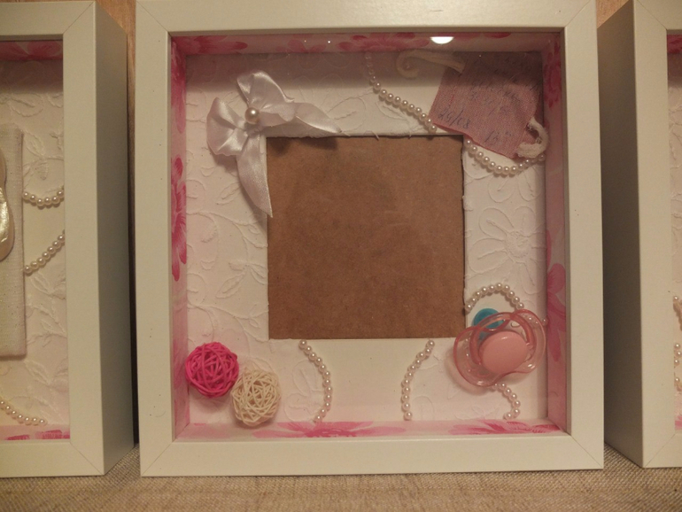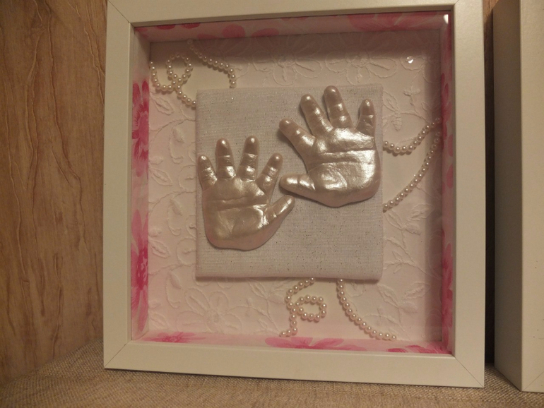 А это ножки ручки старшей в 5,5 мес. Сама делала из гипса. Рамки икеевские. Ткань в рамке белая- остатки с одеялка выписного (сами шили), розовые края рамки - упаковка цветов на выписку, бантик, ну понятно откуда)