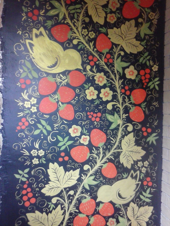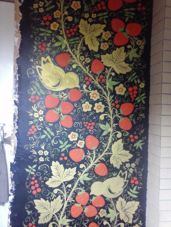 Далее роспись стены на даче. Есть только фото одной стены(( в конечном итоге следующая после печки стена была полностью зеркальной. Получилось очень здорово. Двери золотые.