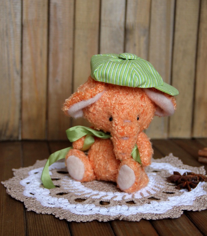 На слоненке хлопковый берет и шелковая лента. Размер 12 см. сидя.