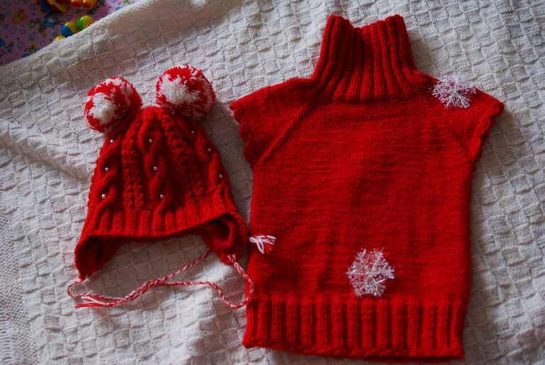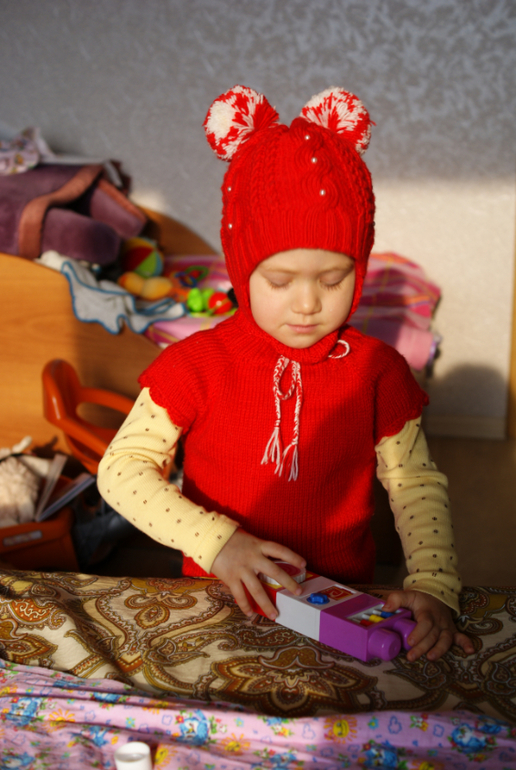Отличный комплект, а цвет какой яркий! Я сейчас тоже азялась вязать из детского каприза, почему-то с недоверием относилась к этой пряже, но ложится ровно, хорошо. А как она в носке? Не закатывается?