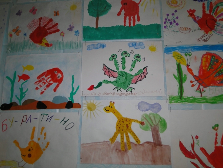 Задача была-превратить детский отпечаток во что-то интересное. Нужно было постараться, чтоб такое напридумывать. Результат-наша выставка!