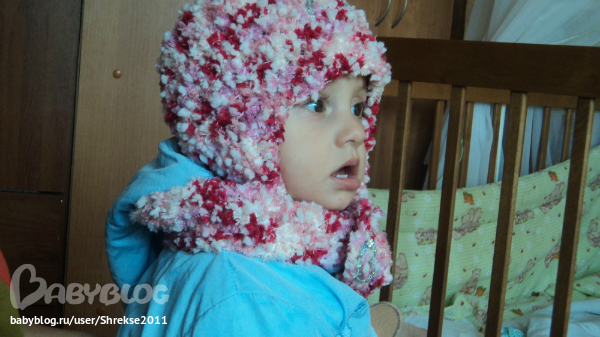 На одном дыхании связался вот такой комплект для любимой малышки,На зиму планирую добавить подклад из флиса,а пока можно носить и так,у нас довольно прохладно.На шапочке пайетками вышита первая буква имени,на шарфике сердечко и застежка "жемчужинка",Вот думаю,может еще пумпончик какой нибудь добавить на шапочку?Критика и предложения приветствуются)