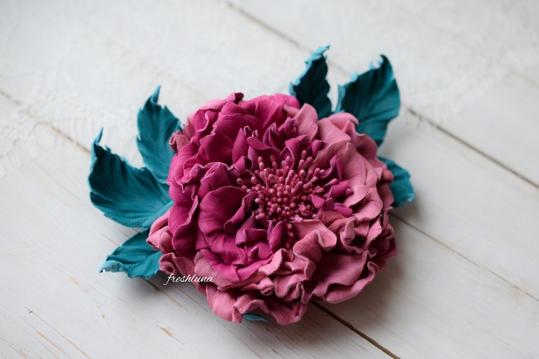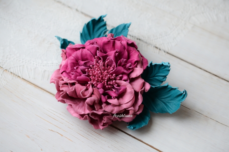 Крепление - брошечная булавка. Все детали броши посажены на японскую проволоку, что позволяет немного изменять композицию и поправлять лепестки и листочки.