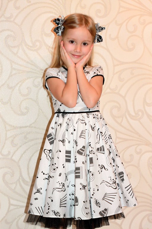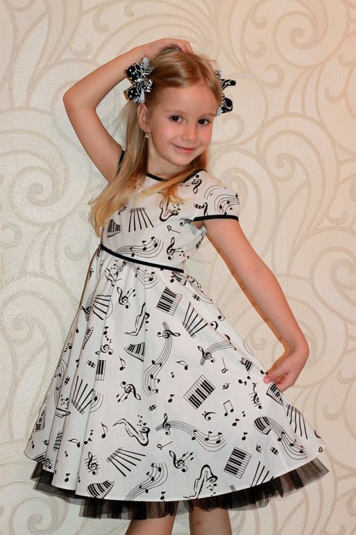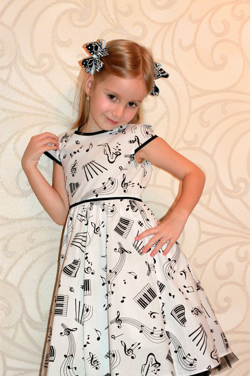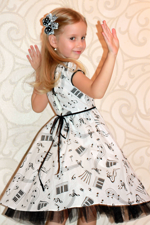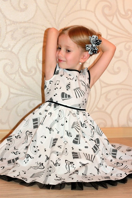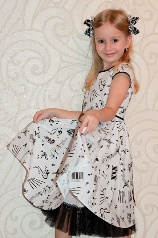 Платье "Веселые нотки" из польского хлопка. Кому-то кажется скучным, а я люблю черно-белое сочетание. Низ - полусолнце со сборкой, для отделки - х/б косая бейка, по низу подъюбника пришита оборка из фатина. Поясок из узкой бархатной ленточки.
