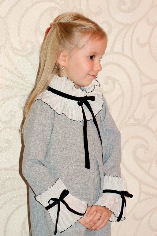 Идея с ВК. Но эта модель встречается сейчас у многих. Мой вариант мне нравится больше, без ложной скромности , т.к. мне удалось найти на Ярмарке Мастеров самое идеальное гофрированное кружево, да и модель платья я копировать не стала, а выбрала ту, что сидит на Полинке "ладненько". В оригинале воротник и манжеты - из гофрированной ленты, как из моего детства.