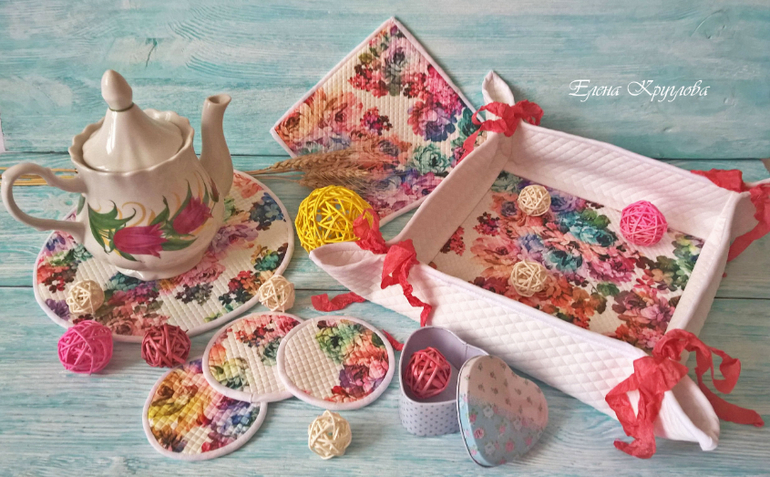 Шитье одежды, выкройки, ремонт одежды, шторы, швейные машины (уже приобретенные)А у меня уже во всю весеннее настроение,поэтому сегодня вот такой наборчик (корзиночка для конфет/печенья/хлеба/фруктов, прихватка, подставка под горячее, подставки для кружек). Набор сшит из трикотажа стежки.