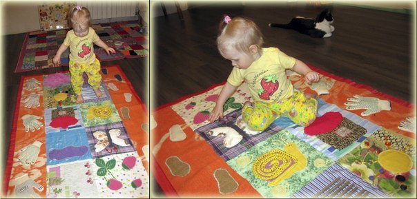 Я заготовила 10 квадратов и пришивала или вшивала в них разные материалы для создания различных тактильных ощущений. Когда все квадраты были соединены между собой, мне показалось, что чего-то не хватает. Я решила добавить «хозяйственные перчатки с пупырышками» и следочки из разного материала. И перчатки и следочки содержали разные наполнители для создания большего массажного эффекта, хотя можно было обойтись и без этого. На заключительном этапе я пришила все заготовки к основе - старому одеялу.