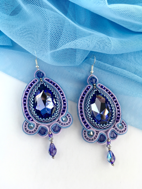 Серьги «Фиалки» напоминают это чудо природы нежными сиреневыми и фиолетовые переливами бисера, голубоватыми многогранниками камней и восхитительными изгибами сутажа. Идеальный компаньон для женственного образа, который внесёт в серую зиму светлое дыхание весны.