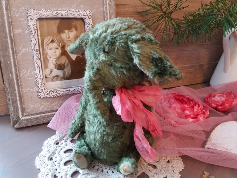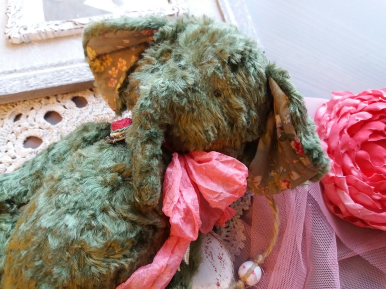 Тедди: мишки и их друзья.Слоник,а может и мамонтёнок сшит из винтажного плюша.Внутри опилки и металлический гранулят.Украшен бантом и кулоном с вышивкой.Слоник сшит полностью вручную с большой любовью и теплом.