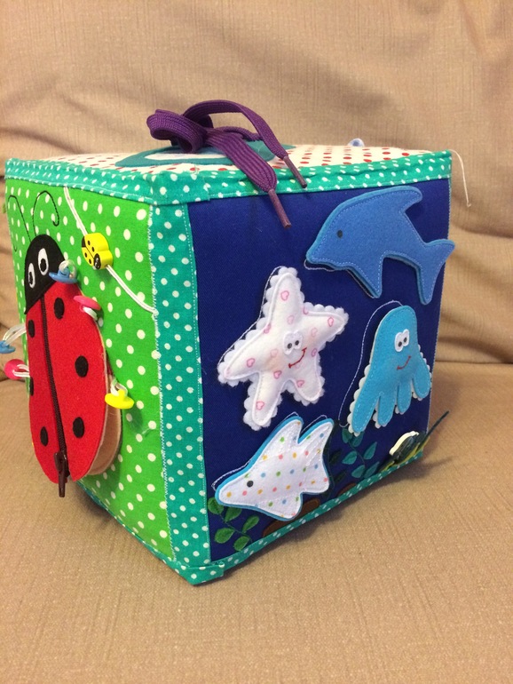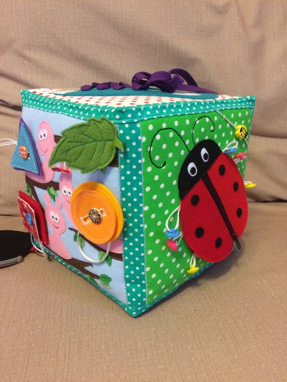 Развивающие игрушкиЭтот чудесный яркий и большой (20 см * 20 см) кубик на днях уехал в Вологду, где радует маленького Глеба и его маму. Юля попросила сделать упор на разные застёжки. Под cut больше 5 фотографий.