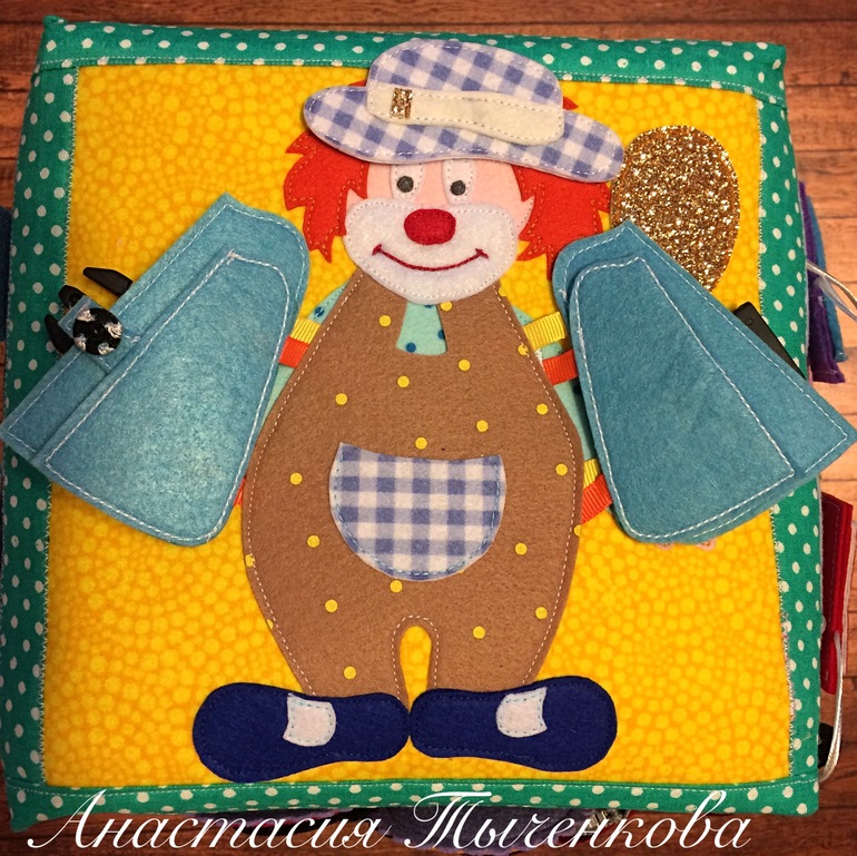 Тут застёжек несколько - и фастекс на первой жилетке, и пришивная кнопка на второй. А чтобы малышу было интересно открывать застёжки, у клоуна в кармане сидит котёнок. Кстати, шляпа у него крепится на магнит.