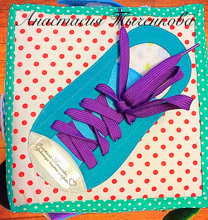 Пятая грань - ботинок. Это тоже С. Контиевской. Здесь мы тренируем умение шнуровать. Кстати, мамы на этом тренажере могут тренироваться и сами умению красиво зашнуровать ботинки.