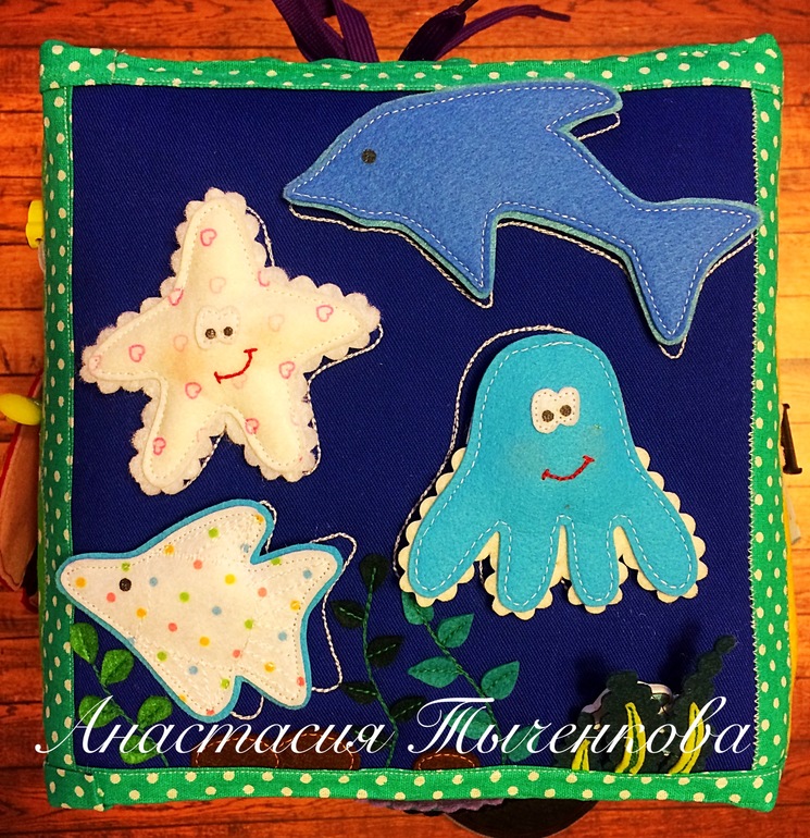 Третья грань - Морские обитатели. Основная застёжка здесь - липучки. И игра - ищем по контуру.