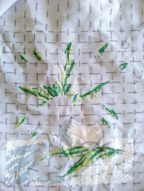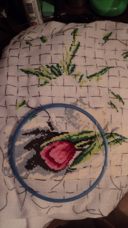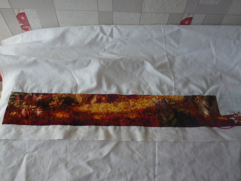 Начинаю сверху,очень точно рассчитав ,что хватит с запасом .И так рядами по 10-15 клеточек и "иду". Приятно видеть,как рисунок появляется, и не скучно и глаза от одного цвета не устают. Так и перекоса нет,и уже вышитое не болтается,так как шью на пяльцах,а иногда и без них. Изнанка горизонтальная,мне так удобно.