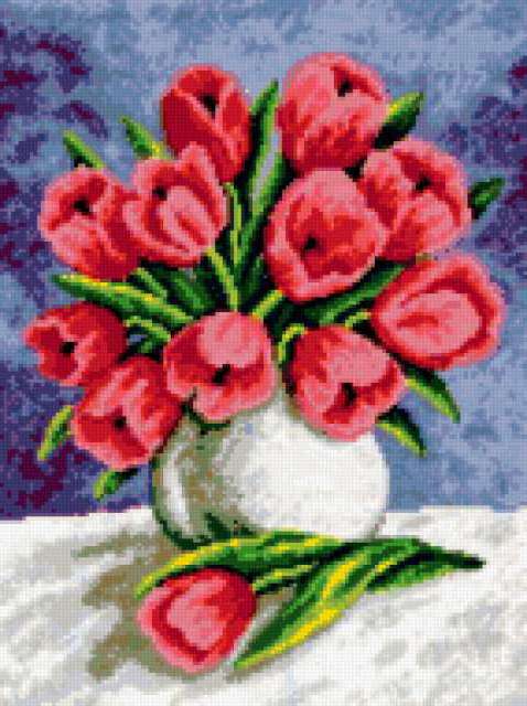 чудесная работа и огромное терпение, подскажите пожалуйста, как правильно вышивать большие картины? отшивать небольшие фрагменты сразу всеми цветами? ато я начала вышивать тюльпаны, не такая огромная как у Вас конечно, но до этого я вышивала только маленькие детские картинки, так что для меня это ощутимо больше. Вышила сначала все детали одним цветом, потом все детали другим цветом, потом третьим, и забросила, так как результата до сих пор невидно. Вот такая у меня должна получится, фото из инета