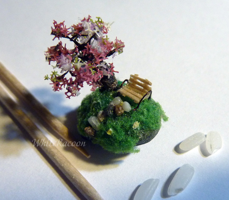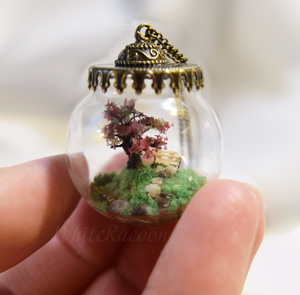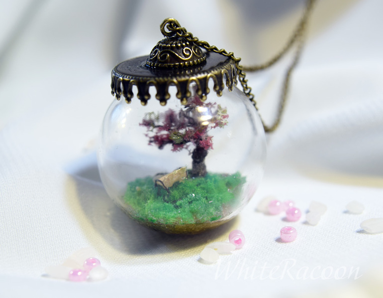 Сфера стеклянная, фурнитура металлическая, земля из песка и эпоксидки, трава из измельчённого в пыль помпончика, сакура из проволоки, клея, красок, "цветочного мха" (крошки губки по сути), скамейка из зубочистки и проволоки, камушки натуральные каменные %)