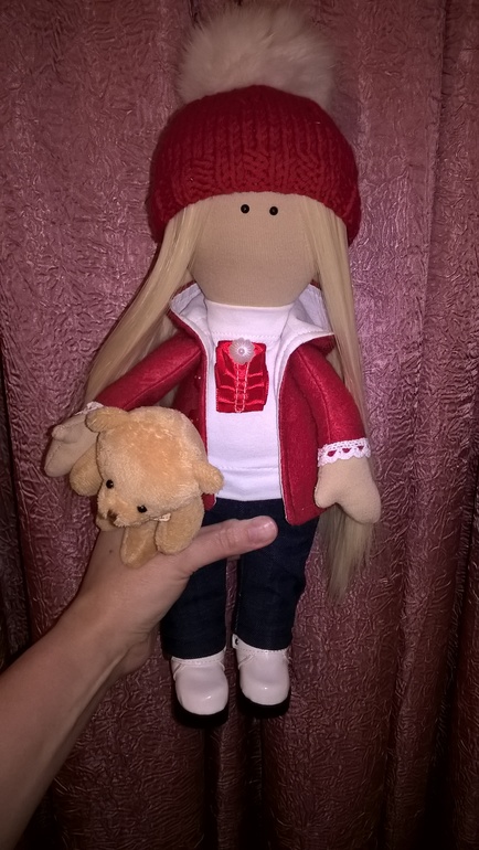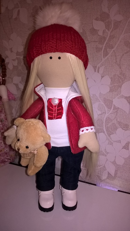 Девочки рукодельницы, хочу предложить на обмен куколку сшила из натуральных материалов, ткань тела белый ангел, одета в джинсы и курточка с капюшоном, шапка с помпоном кролик, в руках любимая игрушка Мишка.