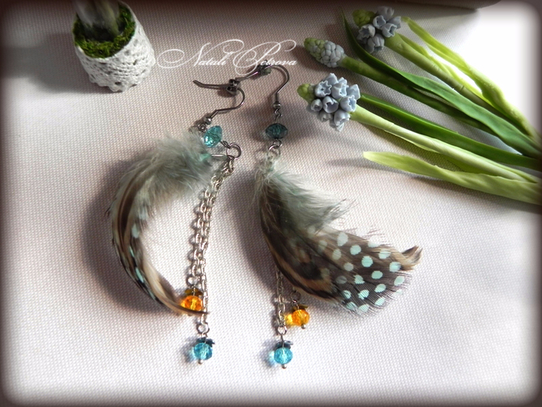 На одной паре не смогла остановиться, поэтому получились еще серьги с перышками со швензами и заглушками из хирургической стали.
