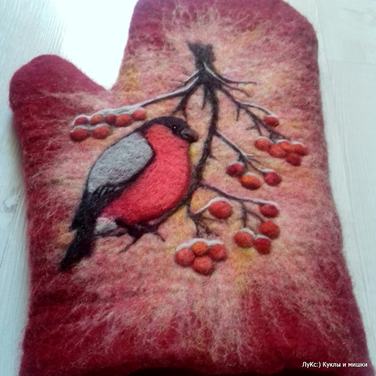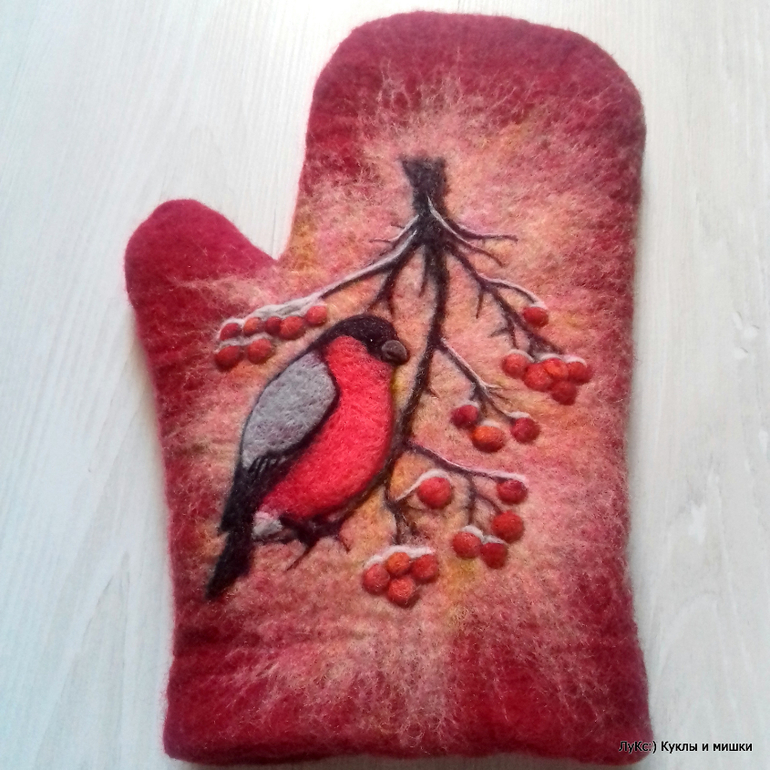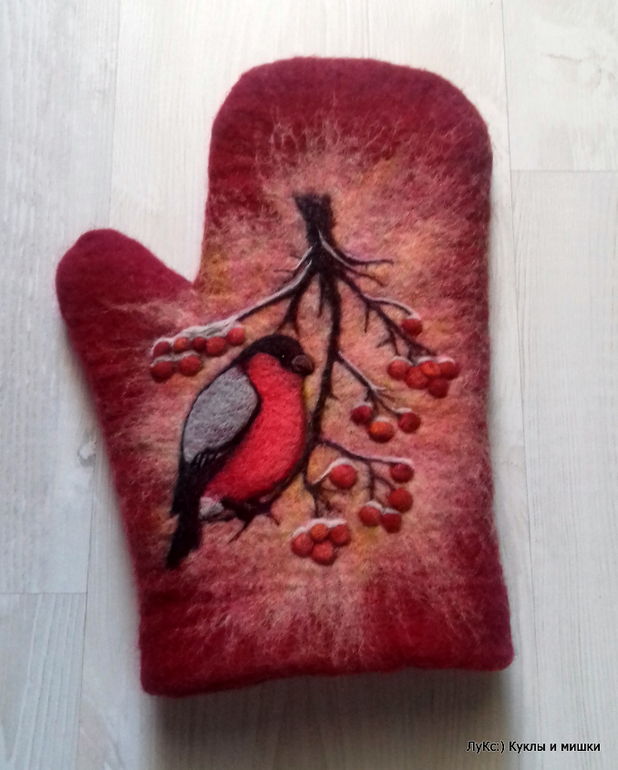 Придумала вот такую варежку-прихватку со снегирем! Морозы же)