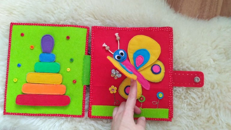 Первый разворот: пирамидка на липучках и бабочка с шуршащими крылышками.