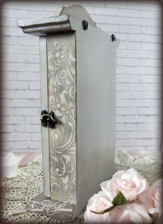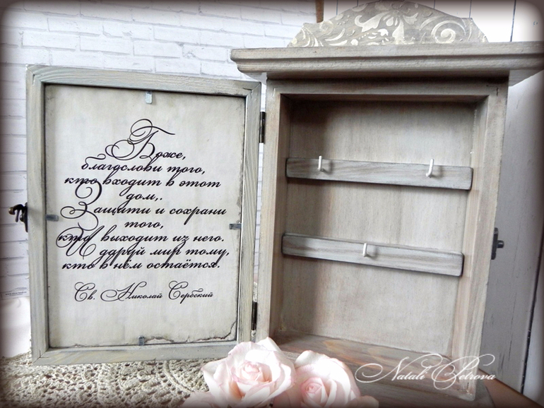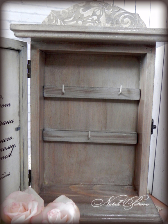 Ключница с дверкой и тремя крючками для ключей. На задней стенке два подвеса.