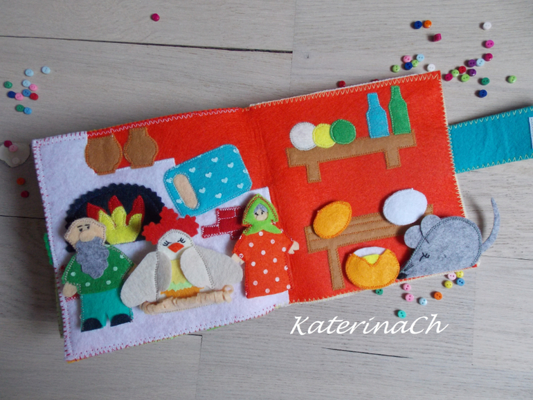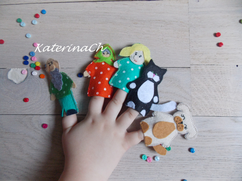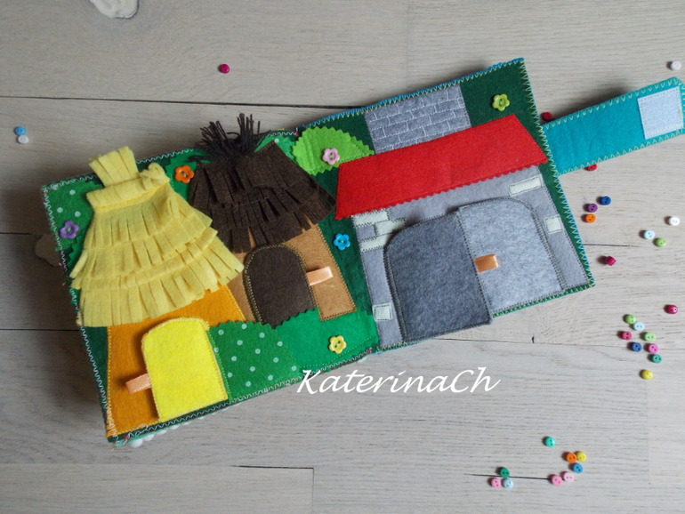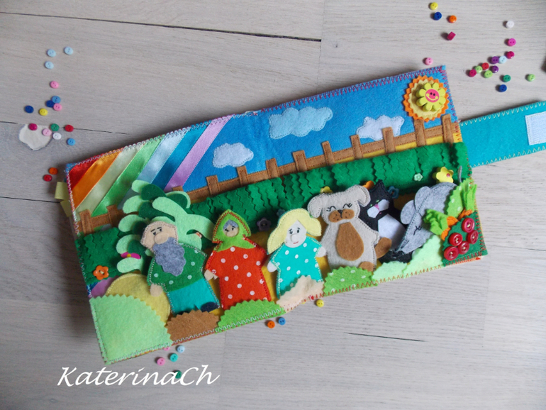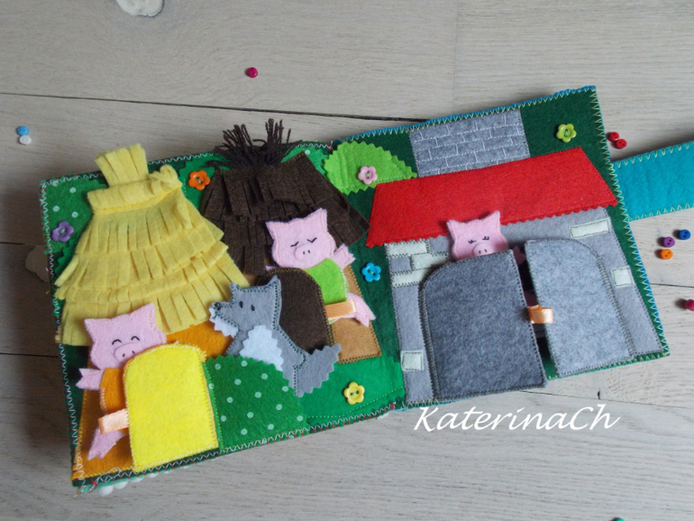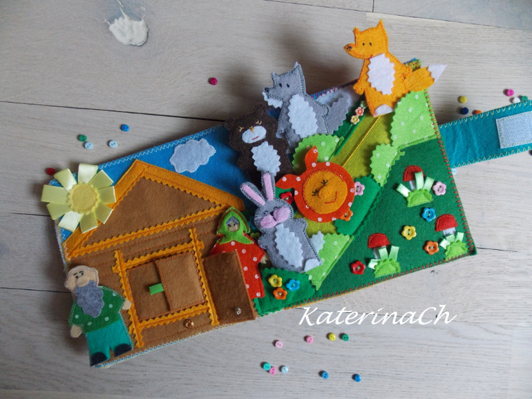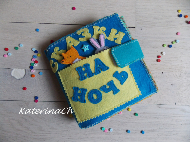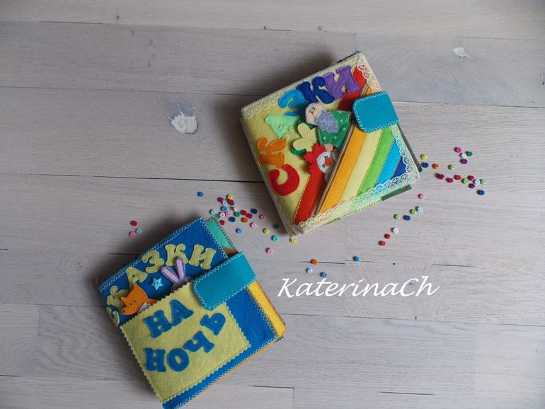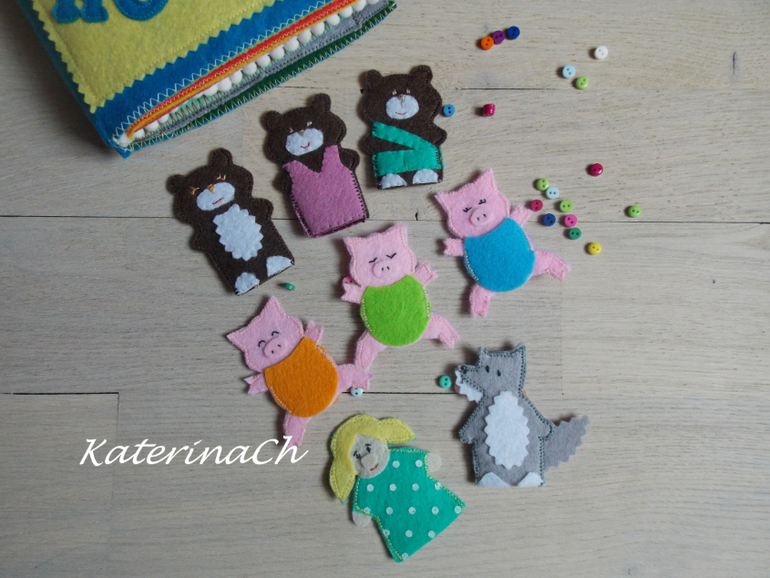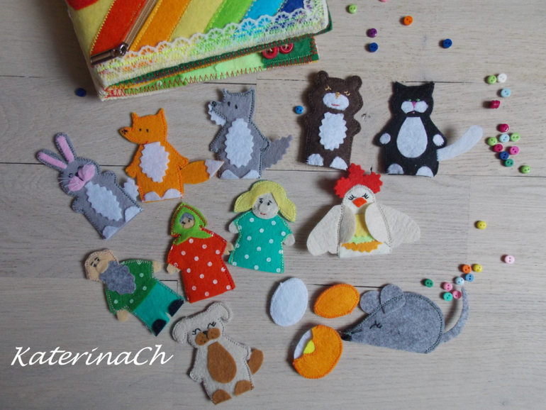 Для начала покажу фетро-сказки.Для удобства было решено разбить сказки по 2м книжкам. Хозяин фетро-книжечек - ещё маленький. Поэтому безопасность по максимуму: никакой мелочевки, всё строго прошито и пришито, даже лица и мордочки сказочных героев вышиты! Зато тактильность - по максимуму(крупные пуговки, ленточки, ниточки...) Одну книжечку было решено сделать для чтения днём, другую - на ночь) И, да, НОВИНКА! - все герои сказок - это ещё и "пальчиковый театр")