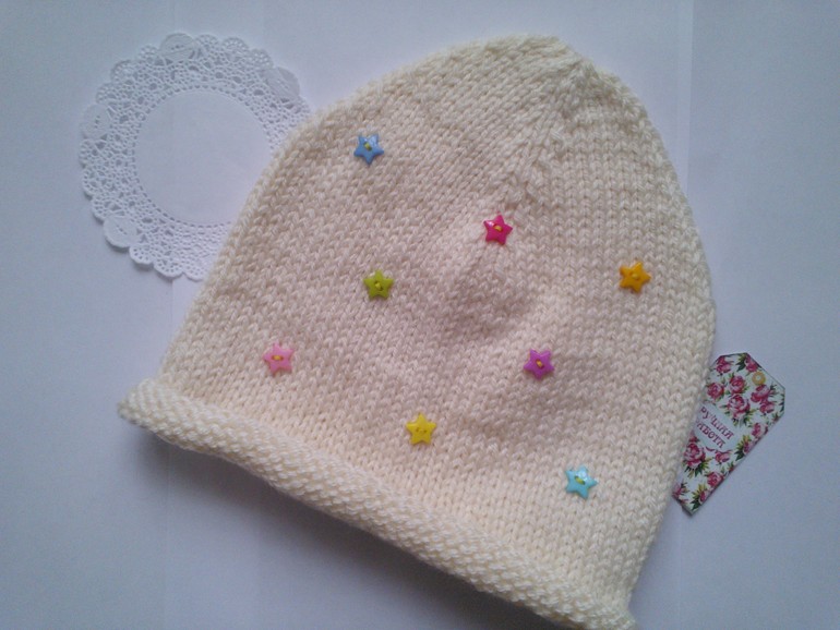 Вязание спицамиЖдем уже весну и готовимся к ней.Шапочка связана лицевой гладью в бежевом цвете и украшена яркими пуговками.Пряжа акрил,мягкая и не скрипучая. Под катом еще одно фото.