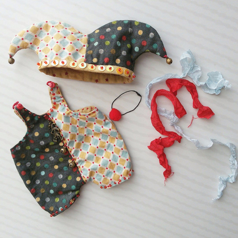 Клепка сшит из винтажного советского плюша, накормлен опилочками и металлическим гранулятом. Глазки стеклянные (Германия). Комбинезон и колпак сшиты из хлопка,тонированы чаем. Вся одежда и нос снимаются.