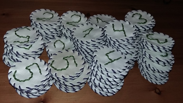 Лично для меня конечно тут было мало творчества. Очень люблю делать сложные и детальные вещи. Повторы не очень люблю, но тут уж куда деваться. У всех деток в саду должны быть одинаковые комплекты..даже в цвете ниток. Хотелось конечно на обратной стороне добавить типа подсказку...пришить кол-во пуговок равное самой цифре, но воспитатели сказали, что это будет только отвлекать деток. Поэтому получились просто цифры )))) Материал Эко-кожа. Он долговечен и деткам будет сложно эти наборы быстро "убить". Всего пришлось вырезать 280 кружков. Цифры ( 140 шт.) делала сначала дыроколом, а потом обшивала нитками. По краям круга тоже работала дыроколом. Руки болели от дырокола жутко...получилось всего около 7.000 дырочек.