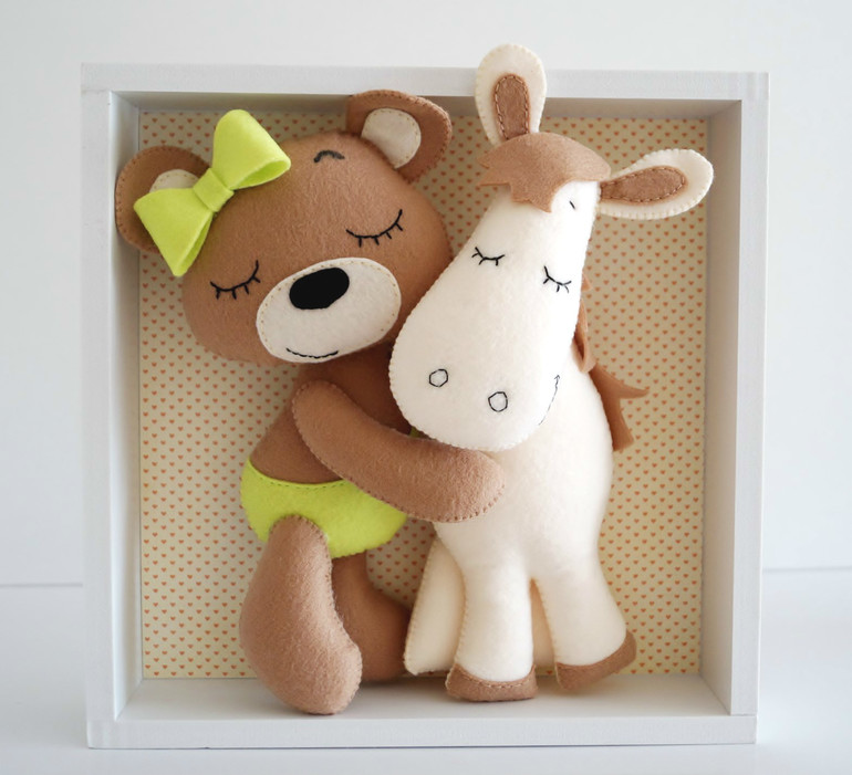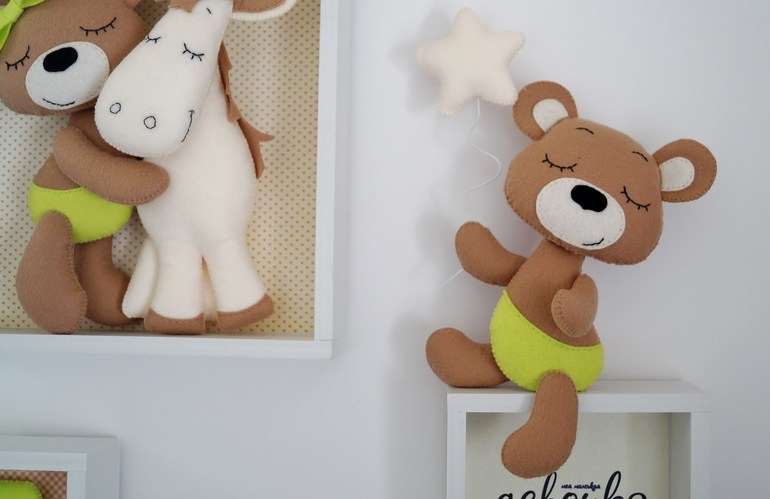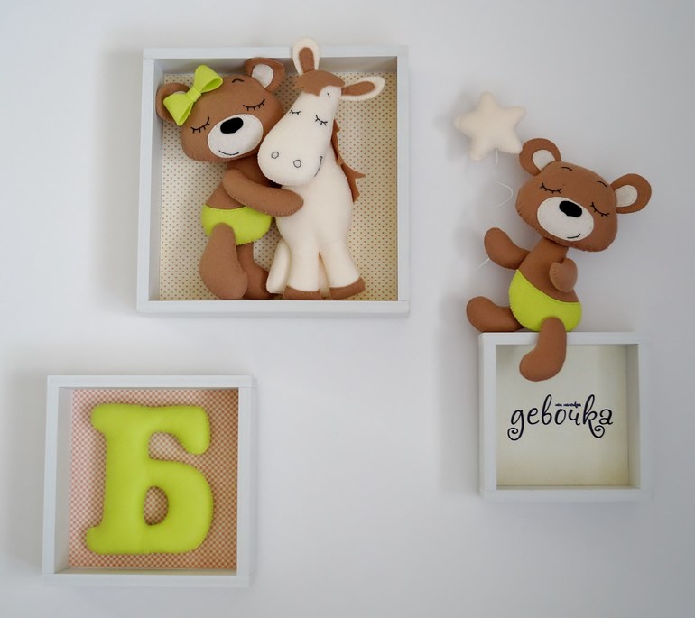 А я продолжаю осваивать фетр. Вот родились у меня полочки для детской с фетровыми мишутками))) полки из пластика, крепятся на липкие застежки, можно без вреда для стены менять местами)) Цвета - под основные цвета комнаты, ну и буква - первая в имени дочки)))