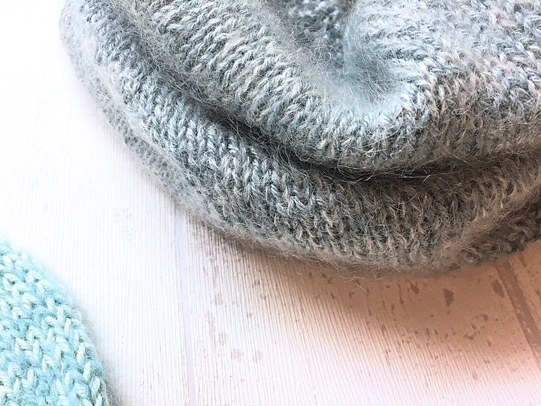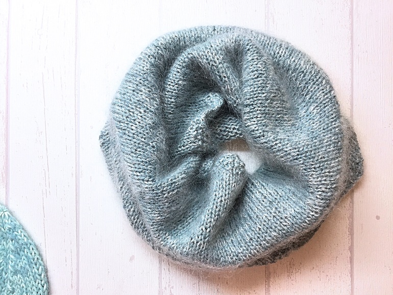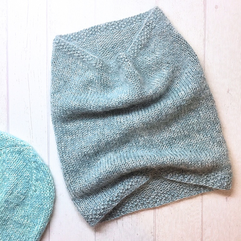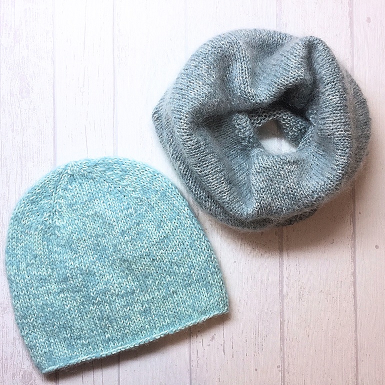 Связался комплект на весну/осень/еврозиму из мягчайшей альпаки с шёлком, мериноса и кид-мохера с шёлком. Шапочка - меринос и альпака, снуд в один оборот - альпака и кид-мохер.