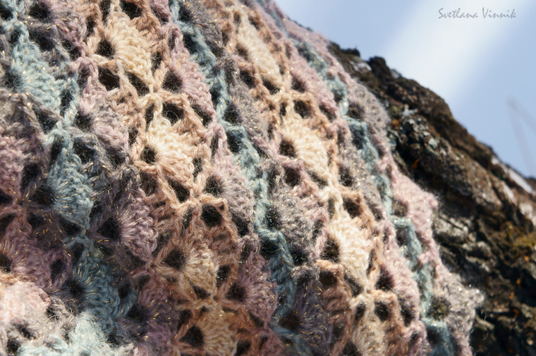 Ира, мне нравится. У меня бело-серо-голубая из такой же. На работе второй год не снимая почти ношу. Тёплая и вид не потеряла. Я когда пришла в магазин, однажды, и показала кусочек шали, то мне сказали, что я вяжу тонким крючком - 3,5. Говорят, для шали надо потолще крючок брать. Эту вязала 4,5. Но можно было и 5. На эту ушло ровно 2 мотка и она довольно большая. Если пятёрочкой, то получится более ажурная и ещё побольше