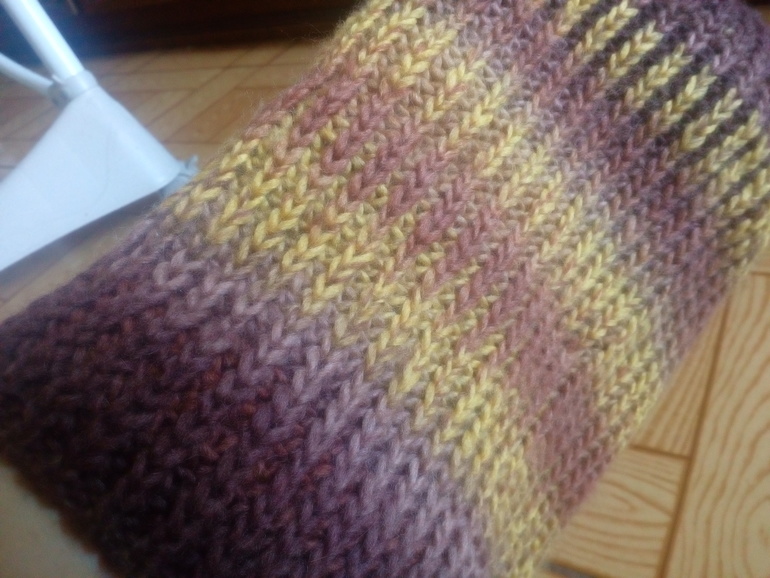 Сочетание бордового, коричневого и желтого не одобрил никто, пришлось распускать (отдельное удовольствие) и отпаривать. Кстати, мокрая пряжа пахнет эээээ ... деревней, по крайней мере, мне напомнило каникулы у прабабушки в деревне. На каком-то сайте о другой, правда, пряже в описании было сказано "восхитительный запах свежевымытой овцы", так что, дело вкуса)) меня этот восхитительный запах преследовал еще два часа после отпаривания. Сухая шапка, к счастью, ничем не пахнет.