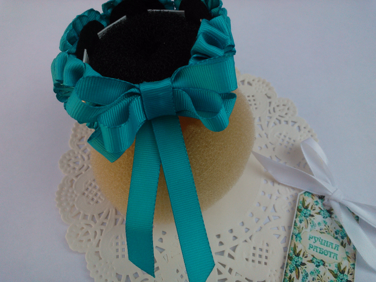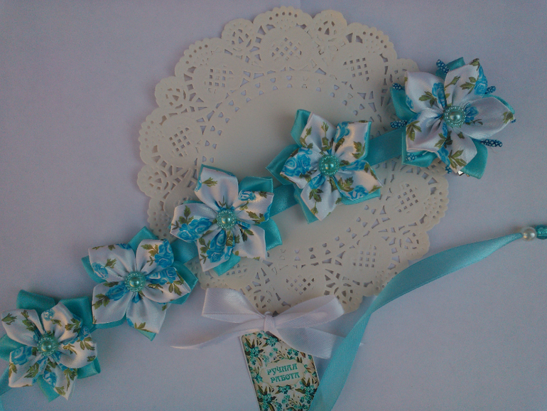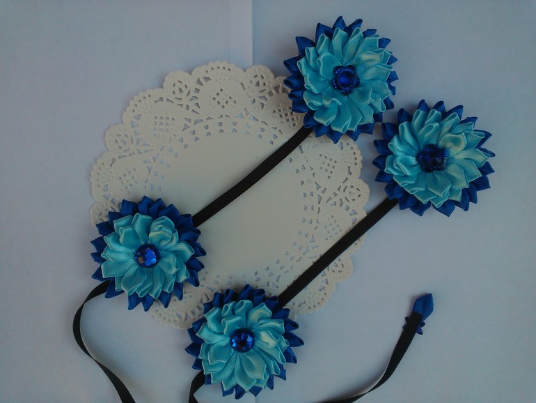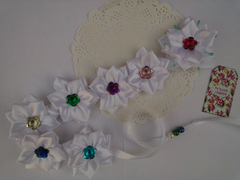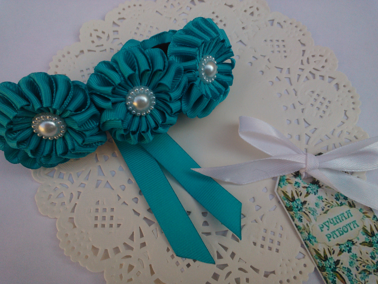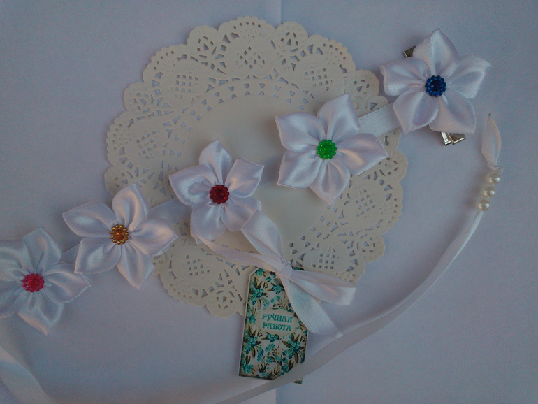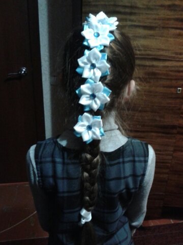 Спасибо.Верхний цветок на ленте на зажиме.фиксируем его и плетем косичку.А в конце резинку.