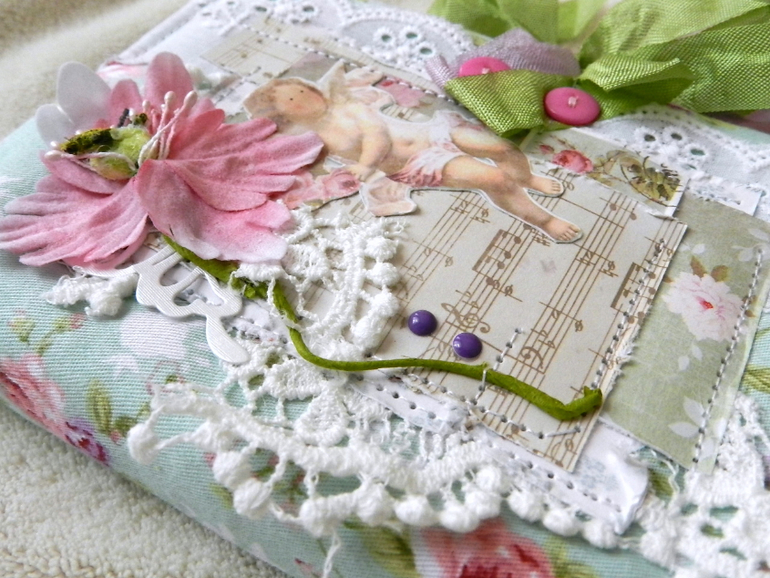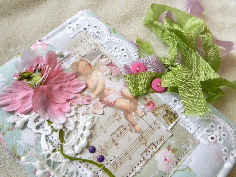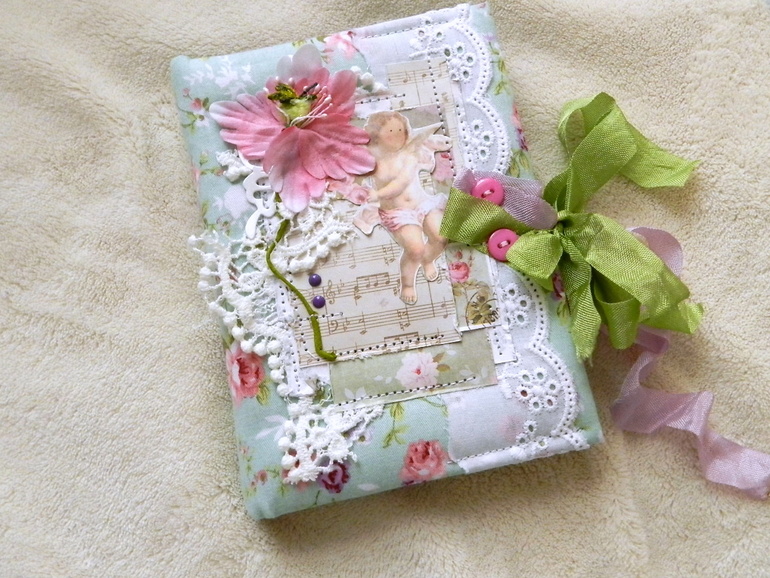 СкрапбукингДобрый день, Красавицы! Сегодня покажу крошку блокнот, который сделала на одном дыхании. Маленький, но вместительный-96 страничек, небесно-васильковых и крафтовых. Завязывается на нежные шебби ленты, украшен кружевом, красивым цветком и ангелом. Будет красоваться в женской сумочке и хранить важные записи.Много фото)