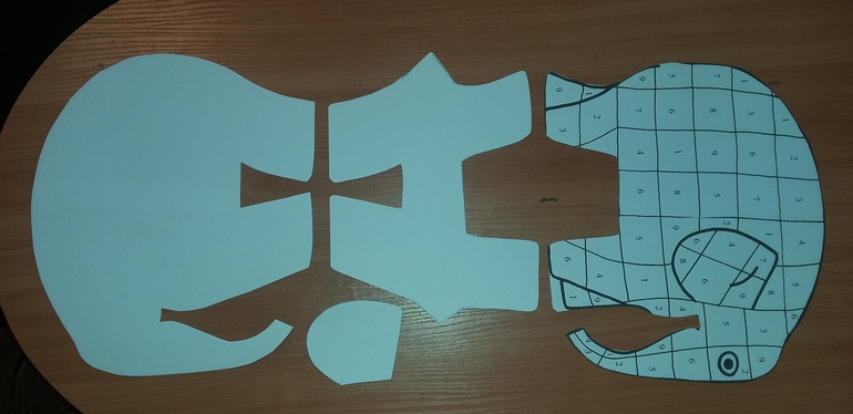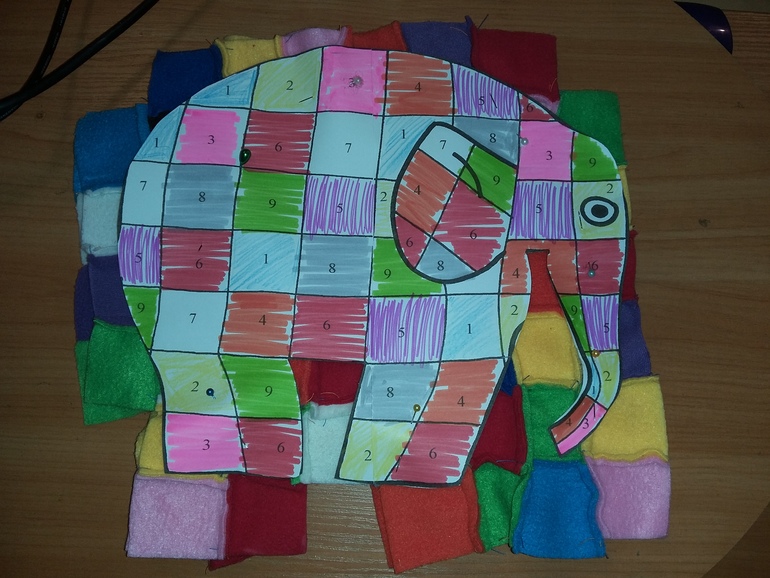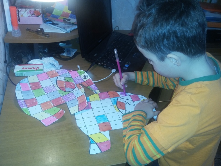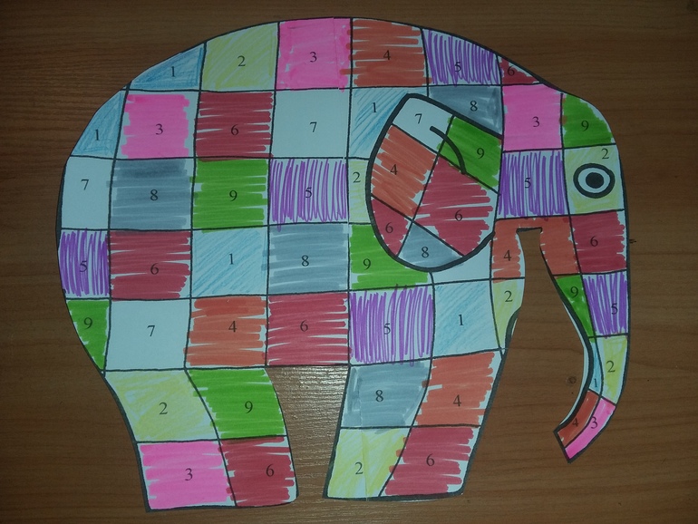 Чтобы понять количество квадратиков каждого цвета, понадобилось раскрасить слона:
