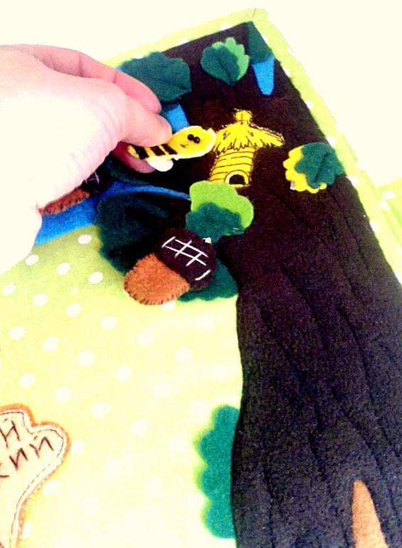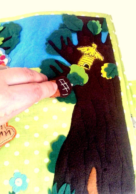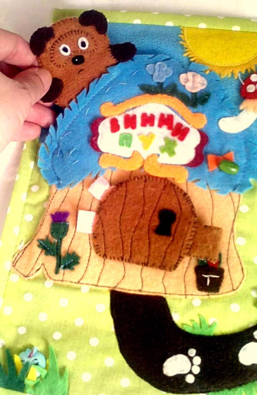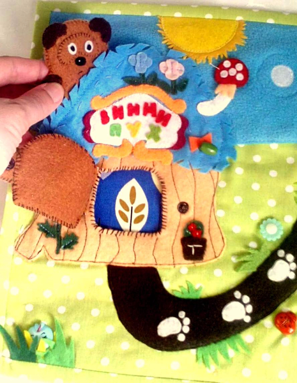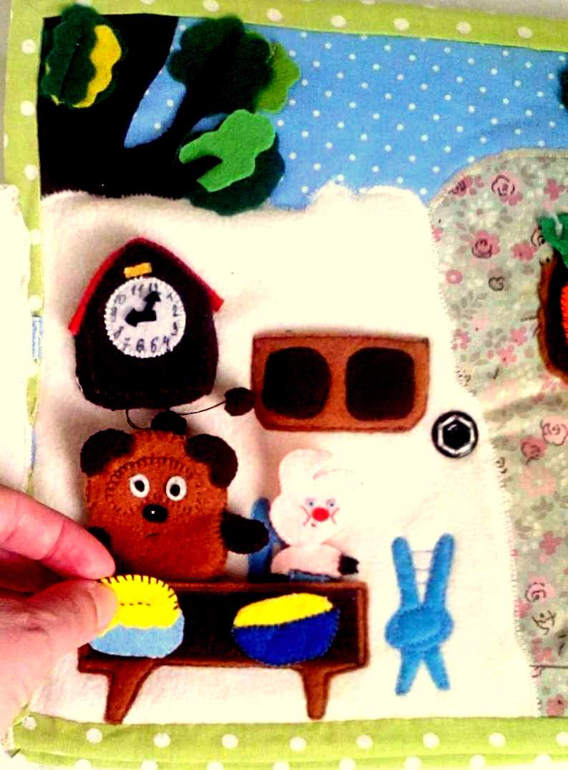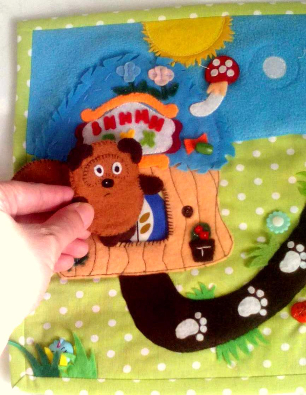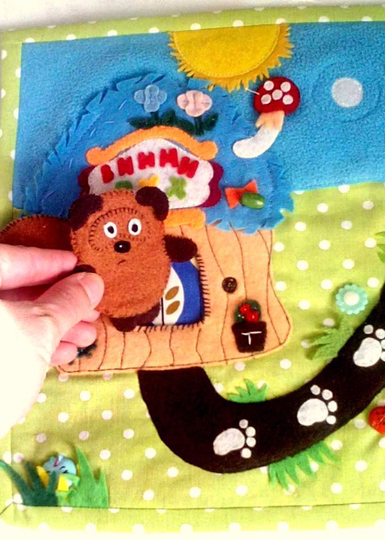 РАЗВИВАЮЩАЯ КНИЖКА ИЗ ФЕТРА По мотивам сказки Винни ПУХ!!! Сказка сшита поэтапно как идет в мультике,детали сьемные(крючки,липучки,кнопки и.т.п Книжка содержит 3 листа, 6 страничек)размер книги 28×28 см),достаточно большая, выполненная из таких материалов как 100% хлопок,фетр ,флис(гипоаллергенна,все детали хорошо прошиты(подойдет для малышей)
